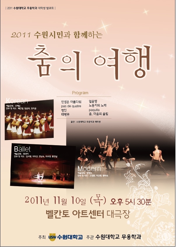 미래지향적 인재와 현장전문가 양성을 지향하는 수원대학교에서 깊어가는 가을을 맞아 '2011 수원대학교 무용학과 재학생발표회' 공연에 귀하를 정성어린 마음으로 초대합니다.