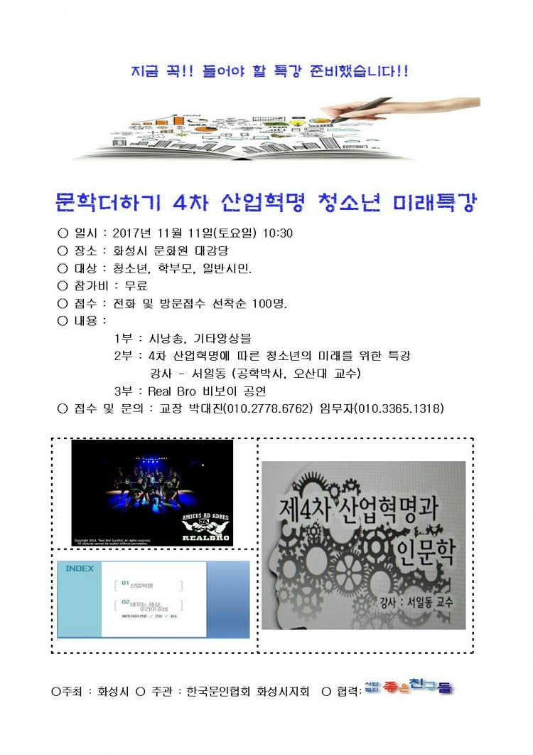 문학더하기 4차산업혁명 청소년문학특강 페이지 정보 작성자 화성예총 댓글 0건 조회 3,222회 작성일 : 17-11-07 본문 문학더하기 4차산업혁명 청소년문학특강 목록 이전글화성음학협회] 난파탄생 120주년 기념음악회 18.04.02 다음글제4회 화성시 전국 청소년 국악경연대회 17.10.30 댓글목록 댓글목록 등록된 댓글이 없습니다.