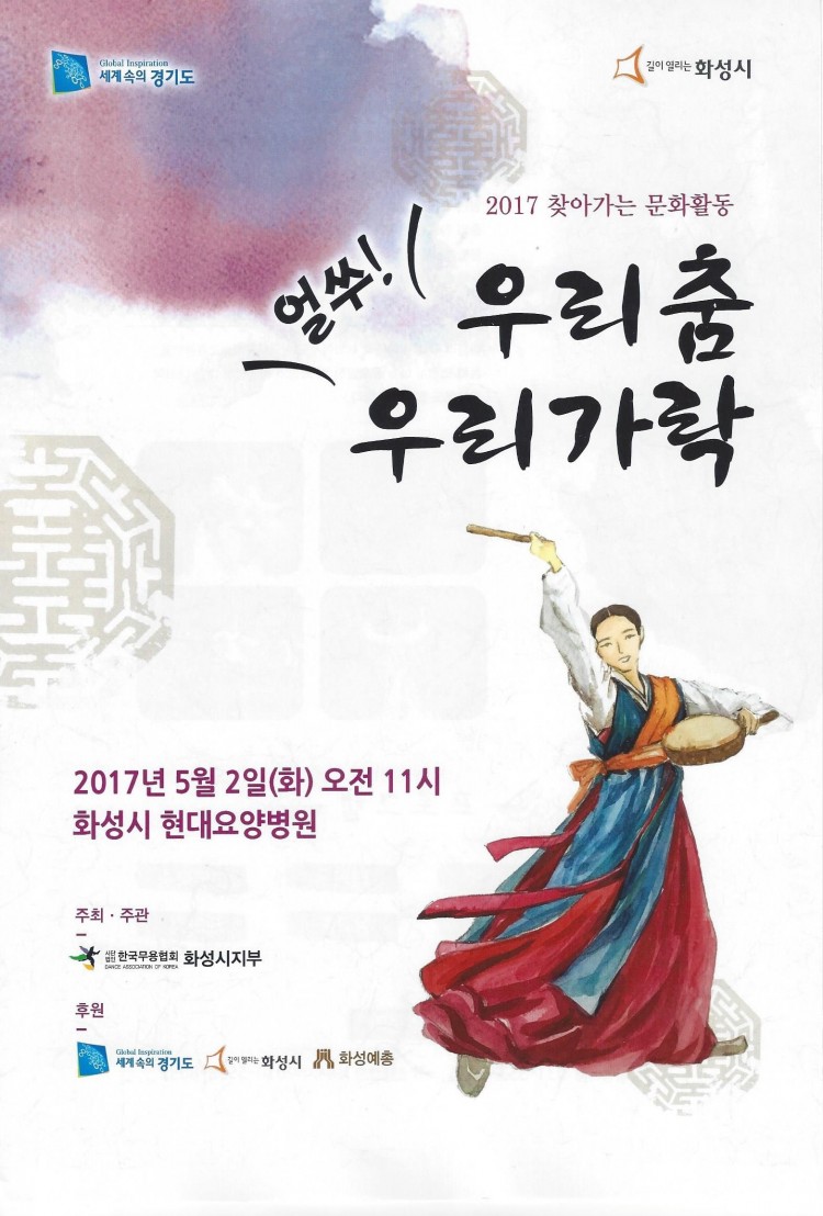 2017 찾아가는 문화활동 "얼쑤 우리춤 우리가락"(3차) 페이지 정보 작성자 화성예총 댓글 0건 조회 3,410회 작성일 : 17-04-28 본문 2017년 5월 2일(화) 오전 11시 화성시 현대요양병원 목록 이전글제19회 화성시청소년교향악단 정기연주회 17.05.31 다음글제12회 진천 농다리 가요제 안내 17.04.27 댓글목록 댓글목록 등록된 댓글이 없습니다.