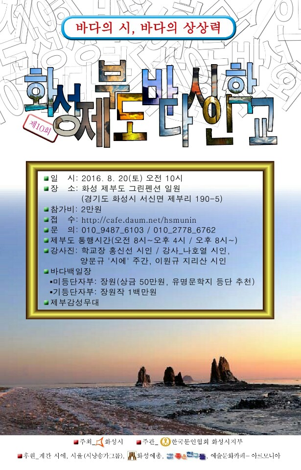 제10회 화성제부도 바다시인 학교 페이지 정보 작성자 화성예총 댓글 0건 조회 3,576회 작성일 : 16-07-26 본문 * 제 10회 화성제부도 바다시인 학교 * 화성시 문인협회에서 그림과 같이 바다시인 학교 행사를 개최합니다. 문학을 사랑하시는 시민 여러분의 참여와 관심 부탁드리겠습니다. 목록 이전글화성시청소년교향악단 제17회 정기연주회 16.08.01 다음글"화성예술제" 일정 공지 16.07.08 댓글목록 댓글목록 등록된 댓글이 없습니다.