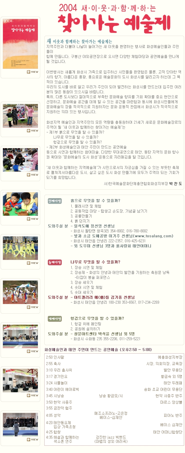 2004-찾아가는예술제 페이지 정보 작성자 화성예총 댓글 0건 조회 2,292회 작성일 : 15-02-26 본문 2004-찾아가는예술제 목록 이전글2017 화성시 문화예술육성지원 공모사업 17.01.17 다음글일제의 침략사 사진전 15.02.26 댓글목록 댓글목록 등록된 댓글이 없습니다.