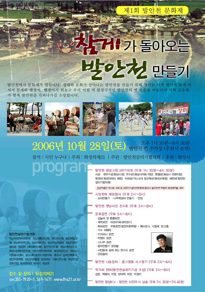_ 먹거리 판매(발안천살리기기금 조성) : 김밥, 떡볶이, 오뎅, 빈대떡, 파전, 막걸리 (오후 2시~8시)