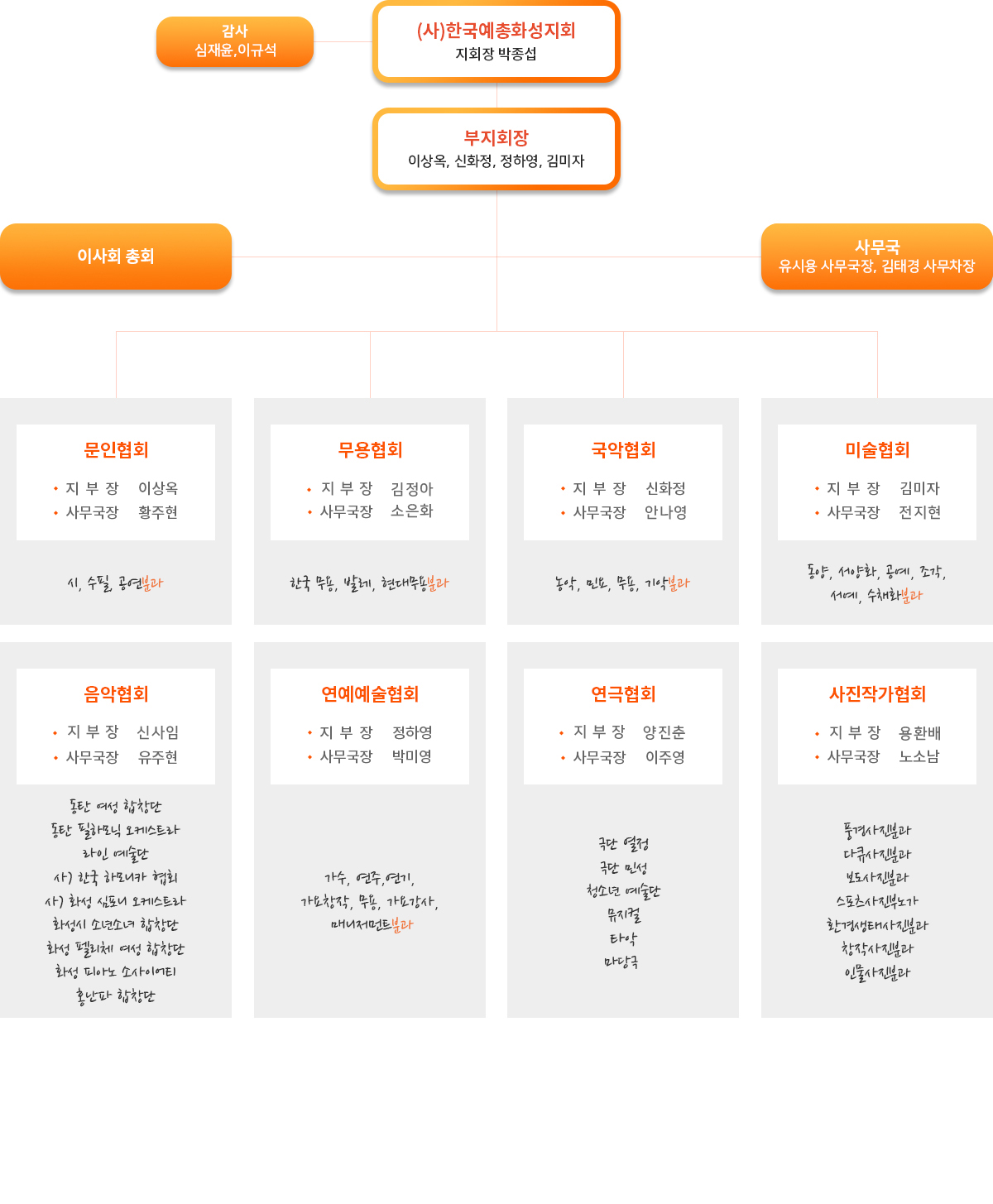 화성예총 구성원 모두가 화성지역사회의 예술 문화 발전에 기여하고, 회원 상호간에 친목 도모를 위해 최선을 다하고 있습니다.
