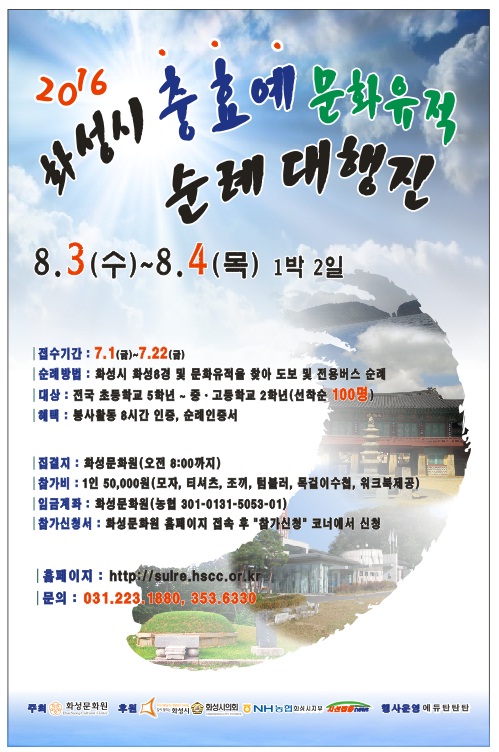 화성문화원- 화성시 충효예 문화유적 순례대행진 페이지 정보 작성자 화성예총 댓글 0건 조회 5,384회 작성일 : 16-07-05 본문 화성문화원에서 화성8경 문화탐방을 실시하고자 합니다. 문화유적에 관심이 있는 청소년들은 첨부파일을 참고하시어 기한내에 접수하여 의미있는 시간을 가져보시기 바랍니다. 문의사항 - 031) 223-1880 , 353-6330 목록 이전글사)한국예총 화성지회 채용 공고 16.08.10 다음글(사)한국예총 화성지회 직원 채용 최종 합격자 발표 16.05.26 댓글목록 댓글목록 등록된 댓글이 없습니다.