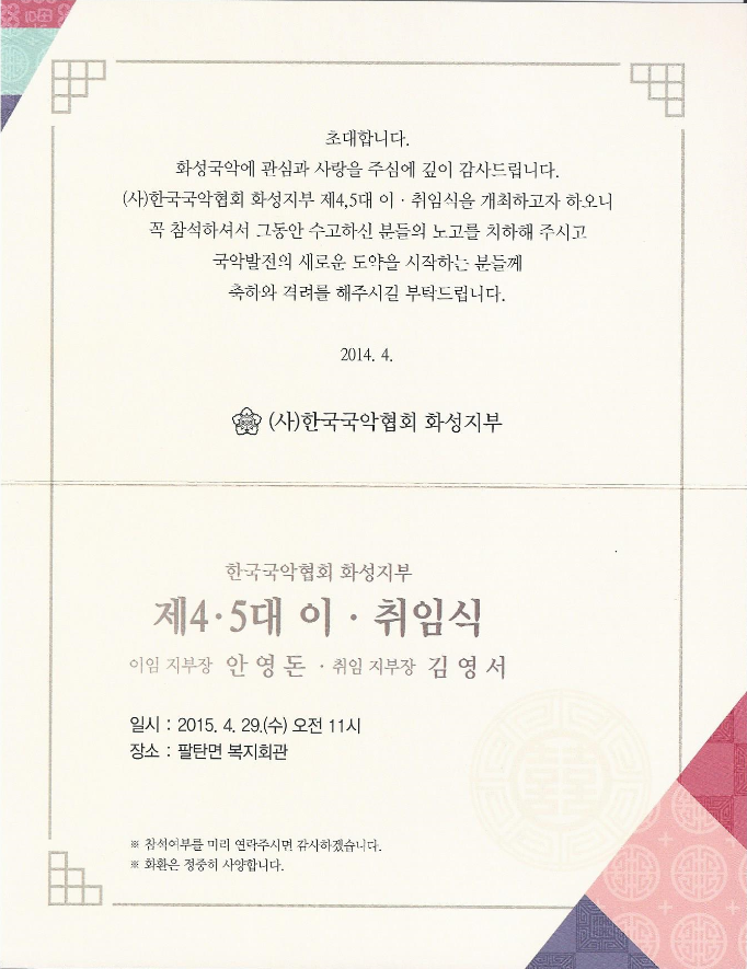 국악협회 지부장 이.취임식 페이지 정보 작성자 화성예총 댓글 0건 조회 5,374회 작성일 : 15-04-28 본문 2015.04.29(수) 오전11시 팔탄면 복지회관에서 한국국악협회 화성지부 제4.5대 지부장 이,취임식이 있습니다. 많은 관심 부탁드립니다. 목록 이전글(사)한국국악협회 화성지부 이.취임식 사진 15.04.29 다음글지역난방공사화성동부지사.화성예총 MOU체결 15.04.06 댓글목록 댓글목록 등록된 댓글이 없습니다.