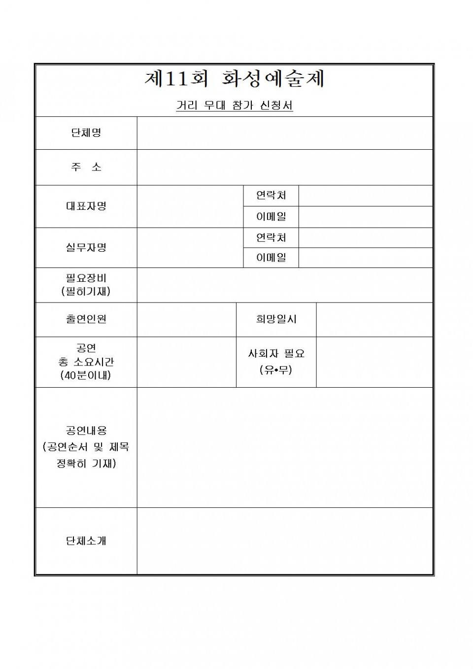 - 제11회 화성예술제 거리 무대 신청서.pdf (42.1K) 136회 다운로드 | DATE : 2015-07-09 16:24:48