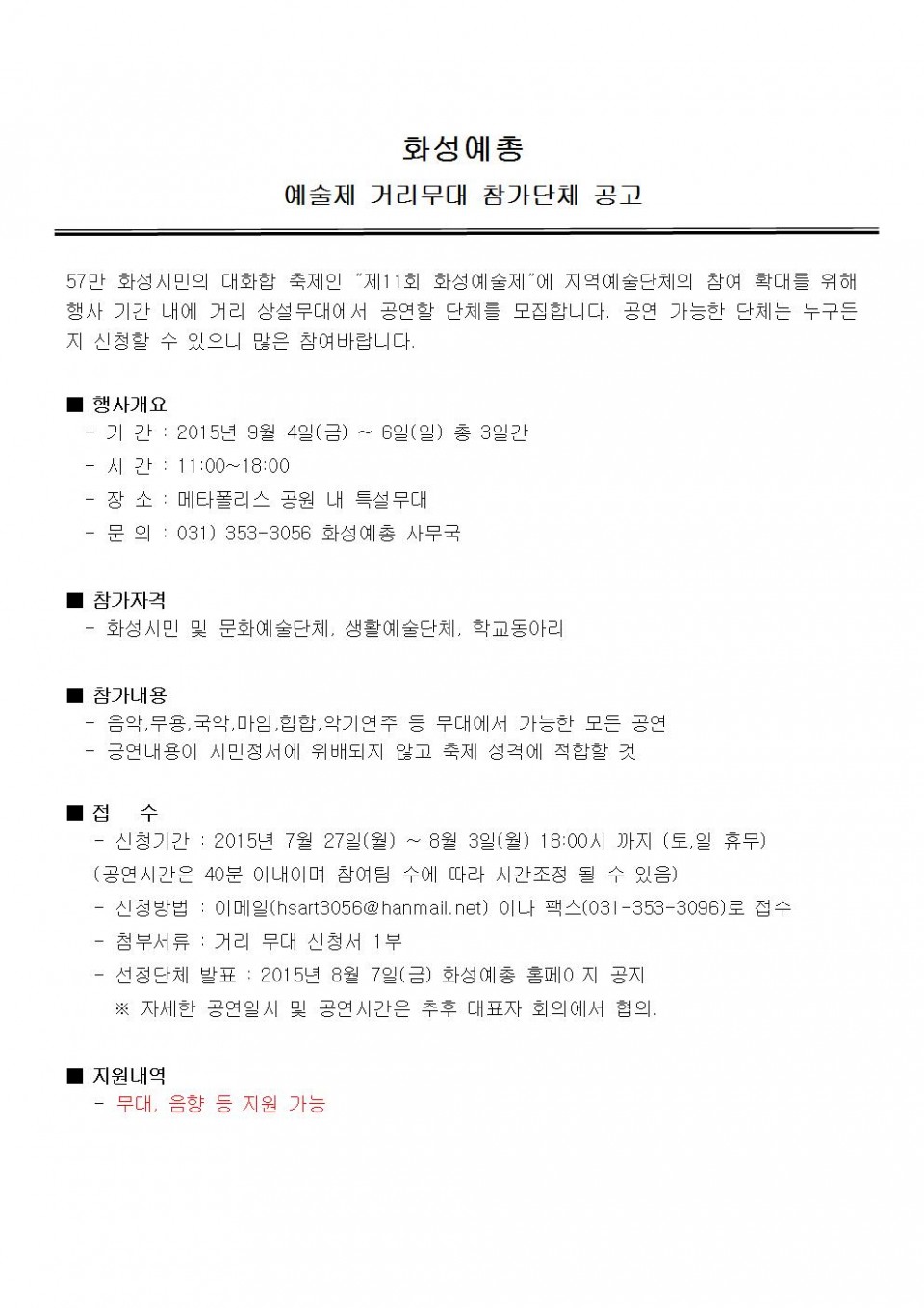화성예총 예술제 거리무대 참가단체 공고