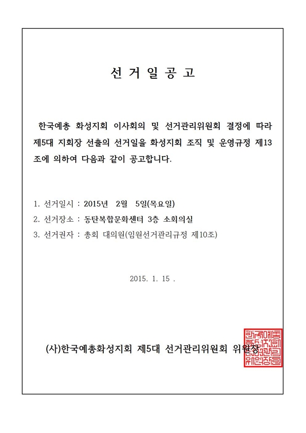 제 5대 지회장 선출의 선거일을 화성지회 조직 및 운영규정 제13조에 의하여 붙임과 같이 공고합니다,