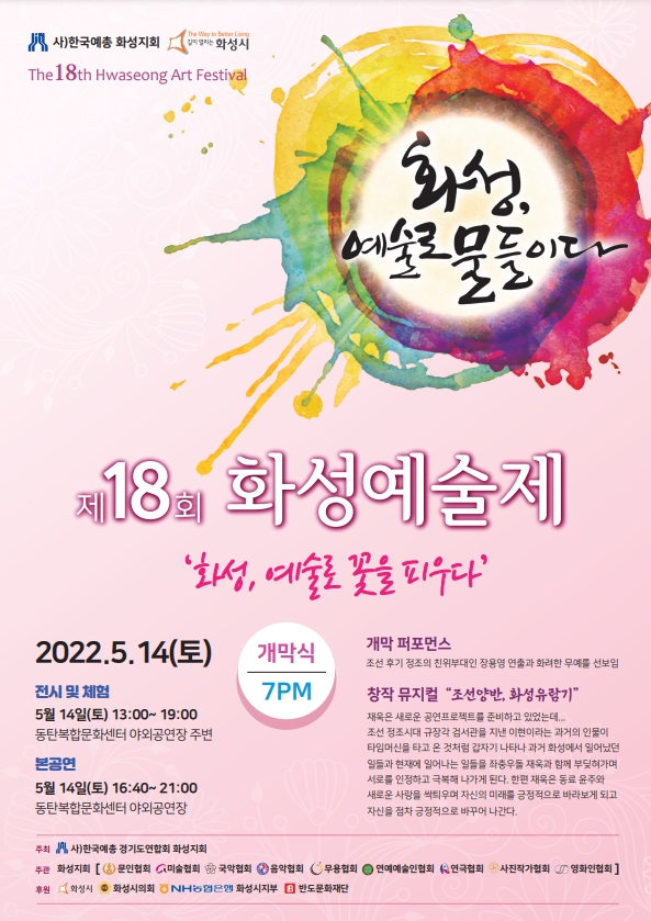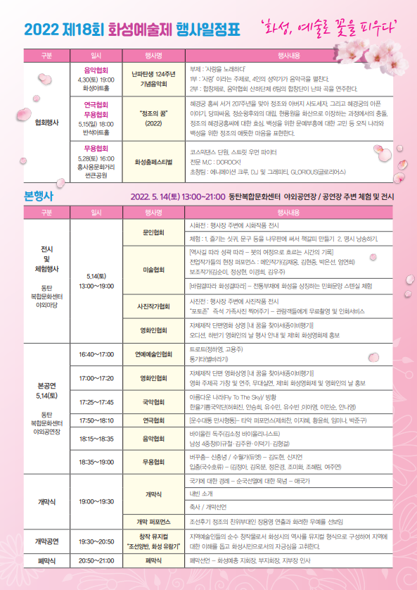 [제18회 화성예술제] 개최 안내 페이지 정보 작성자 최고관리자 댓글 0건 조회 4,054회 작성일 : 22-04-18 본문 [제18회 화성예술제] 개최 안내2022년 5월 14일(토) 개막식 오후 7시 동탄복합문화센터 야외공연장 목록 이전글화성시음악협회, 30일 난파 탄생 124주년 기념음악회 개최 22.05.03 다음글동탄복합문화센터도서관과 업무협약 체결 22.04.13 댓글목록 댓글목록 등록된 댓글이 없습니다.