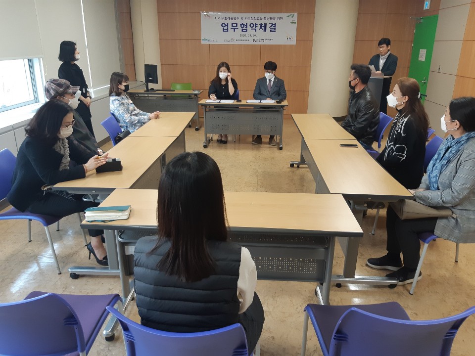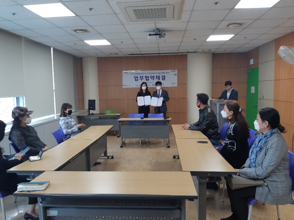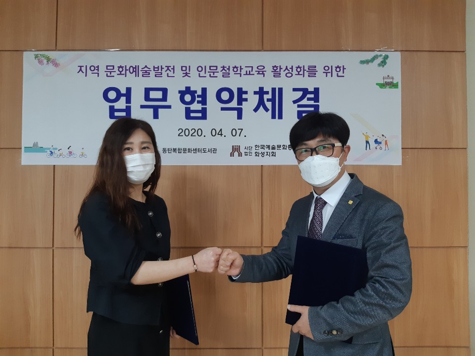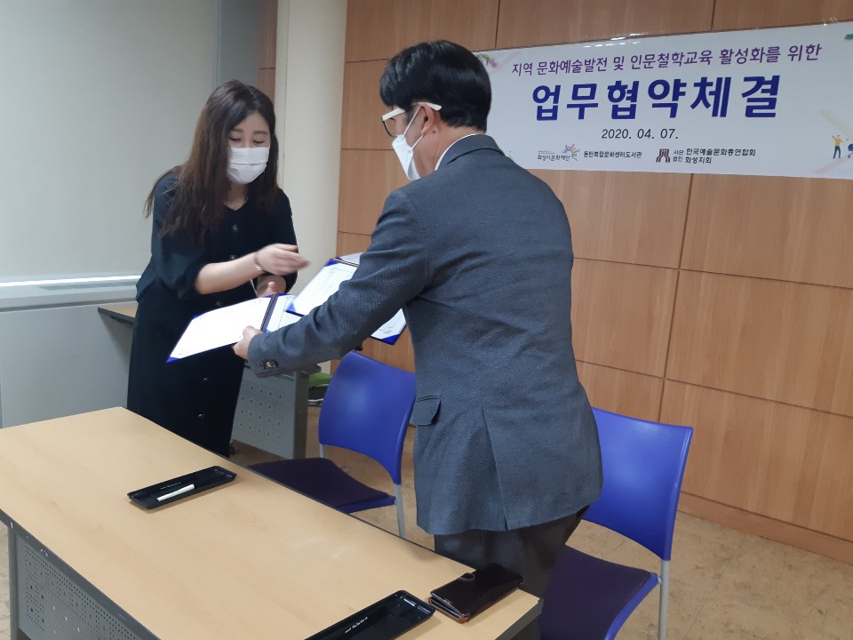 4월 7일 오후 4시 30분 화성시 동탄복합문화센터 문화교실에서는 동탄복합문화센터 도서관 이경화 팀장과 사단법인)한국문화예술총연합회 화성시지부 양진춘 지회장과의 상호신뢰를 바탕으로 『지역 문화예술발전 및 인문철학교육 활성화를 위한 공동 업무 협약식을 체결하였다.